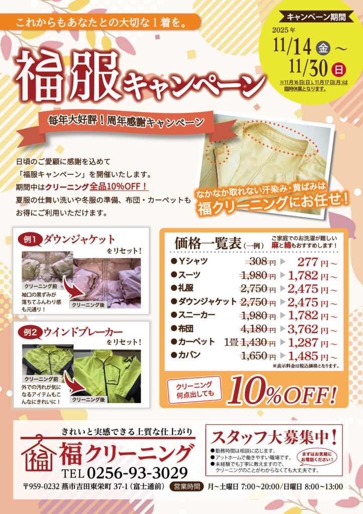 この機会に、ぜひ福クリーニングをご利用下さい。