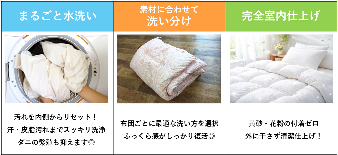 毎日使う布団だからこそ、中までしっかり洗うことで、より清潔で気持ちのいい状態に整えることができます。